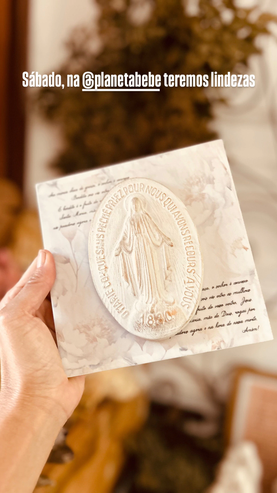 Azulejo 15x15 com a imagem da medalha milagrosa em gesso pintada e selada. Este item é perfeito para quem busca um toque de espiritualidade e estilo na decoração.